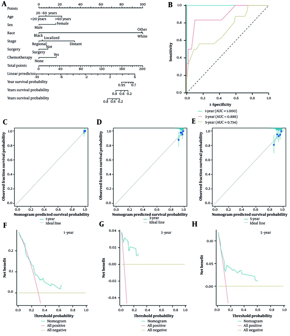 ![Construction of prognostic nomogram and validation. A, nomogram for 1-, 2-, and 3-year survival rate of children with parosteal osteosarcoma (POS); B, the area under the curve (AUC) values for the nomogram model at 1, 3, and 5 years overall survival; C - E, calibration plot of a nomogram for 1-year,3-years,5-years survival rate of children with POS; F-H, decision curves of the nomogram predicting ability [Note: 10-fold cross-validation Concordance Index (C-Index): 0.712 (bootstrap 95 % CI 0.656 - 0.768). Owing to only one death within 12 months among 120 patients, the 1-year AUC of 1.000 reflects an extreme leverage effect rather than overfitting; this value is therefore retained]. Construction of prognostic nomogram and validation. A, nomogram for 1-, 2-, and 3-year survival rate of children with parosteal osteosarcoma (POS); B, the area under the curve (AUC) values for the nomogram model at 1, 3, and 5 years overall survival; C - E, calibration plot of a nomogram for 1-year,3-years,5-years survival rate of children with POS; F-H, decision curves of the nomogram predicting ability [Note: 10-fold cross-validation Concordance Index (C-Index): 0.712 (bootstrap 95 % CI 0.656 - 0.768). Owing to only one death within 12 months among 120 patients, the 1-year AUC of 1.000 reflects an extreme leverage effect rather than overfitting; this value is therefore retained].](https://services.brieflands.com/cdn/serve/31710/60563954297dfeca3869b8a5372dd0055829d1a7/ijp-35-6-157542-i003-preview.webp)
