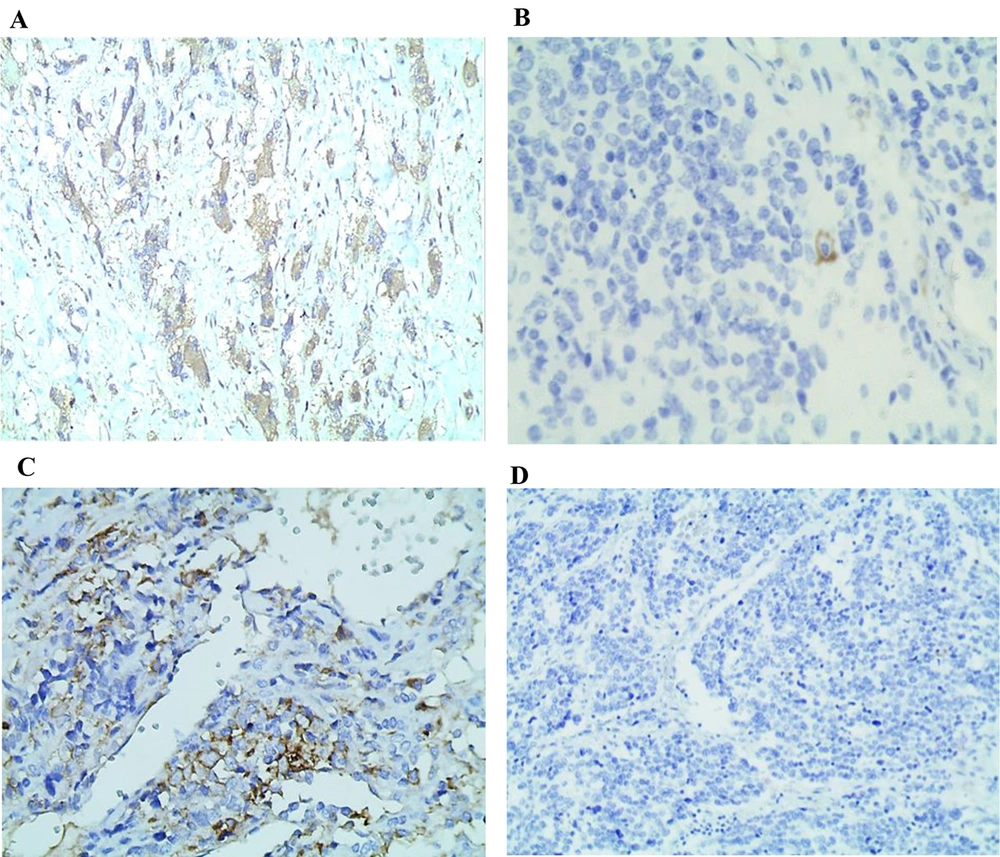 In the current study, PD-L1 immunostaining was positive in 5 (27.8%) patients and negative in the remaining 13 (72.2%) patients as seen in Figure 1 A-D. The patient’s characteristics and immunohistochemical staining results are presented in Table 1.