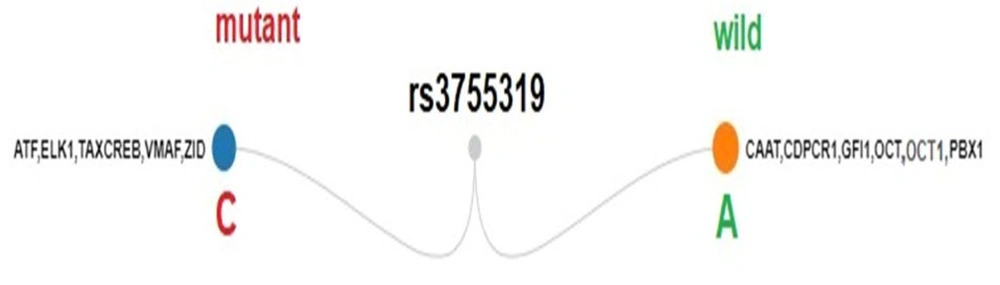 In silico analysis using TFBIND revealed that the rs3755319 SNP may alter transcription factor (TF) binding. A comparison of wild-type and mutant alleles showed that several TFs — including CAAT, CDPCR1, GFI1, OCT, OCT1, and PBX1 — were predicted to bind to the wild-type sequence but lost their binding affinity in the presence of the mutant allele. This loss suggests a potential disruption in transcriptional regulation mediated by these factors. For example, OCT1 is known to modulate gene activation or repression depending on the biological context, while PBX1 is frequently implicated in the regulation of genes involved in cellular differentiation and development (23, 24).