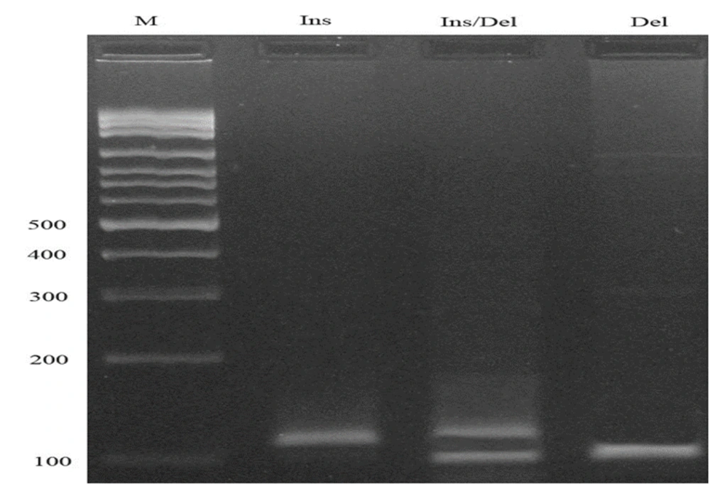 The rs201295078 (14-bp insertion/deletion, I/D) polymorphism was detected using a conventional PCR method. PCR cycling conditions included an initial denaturation at 95°C for 5 minutes, followed by 30 cycles of 30 seconds at 95°C (denaturation), 27 seconds at 66°C (annealing), and 30 seconds at 72°C (extension), with a final extension at 72°C for 10 minutes. The resulting fragment sizes were 114 bp for the insertion allele and 100 bp for the deletion allele (Figure 2).