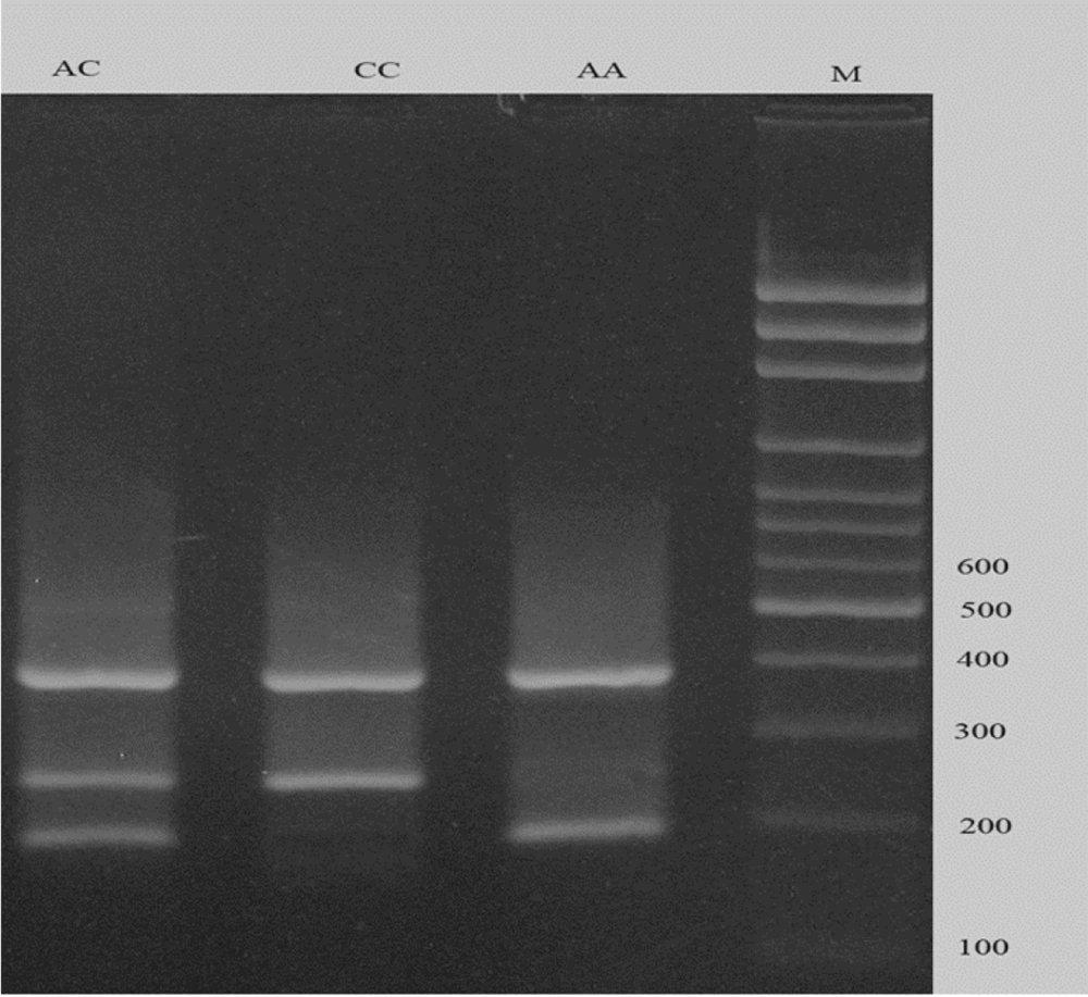 To genotype the rs3755319 A/C polymorphism, the tetra-primer amplification refractory mutation system polymerase chain reaction (T-ARMS-PCR) method was employed. Primer sequences are listed in Table 1. The product sizes were 192 bp for the A allele, 254 bp for the C allele, and 390 bp for the two outer primers (control band) (Figure 1). Each 20 μL PCR reaction contained 1 μL of DNA (approximately 100 ng/μL), 1 μL of each primer, 10 μL of 2X Prime Taq Premix, and 5 μL of double-distilled water (ddH2O were added. The conditions for PCR cycling were determined as follows: Five minutes initial denaturation at 95°C, followed by 30 cycles consisting 30 seconds denaturation at 95°C, 30 seconds annealing at 57°C, and 30 seconds at 72°C for extension. A final extension was established at 72°C for 5 minutes. In order to analyze the PCR results, electrophoresis on a 2% agarose gel supplemented with ethidium bromide was used. Subsequently results were visualized under UV).