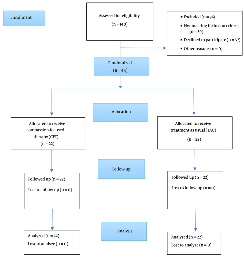 Using G*Power version 3.1 (30), a repeated measures analysis of variance (ANOVA) was conducted with a test power of 0.80, an alpha level of 0.05, and a medium effect size (0.53) based on a similar study (27) comparing two groups across three measurement points. The analysis determined that a total of 38 participants would be appropriate for this study, allocating 19 participants each to the experimental and control groups. To accommodate potential dropouts and to enhance the sample size by 15%, 44 women diagnosed with breast cancer, aged between 30 to 57, were chosen from Yasrebi and Beheshti Hospitals in Kashan through convenience sampling. They were randomly assigned to both the experimental and control groups, with 22 participants in each. The random assignment of eligible participants to the CFT and control groups was facilitated using a randomization website designed for psychological experiments, medical trials, and field studies at www.randomizer.com.