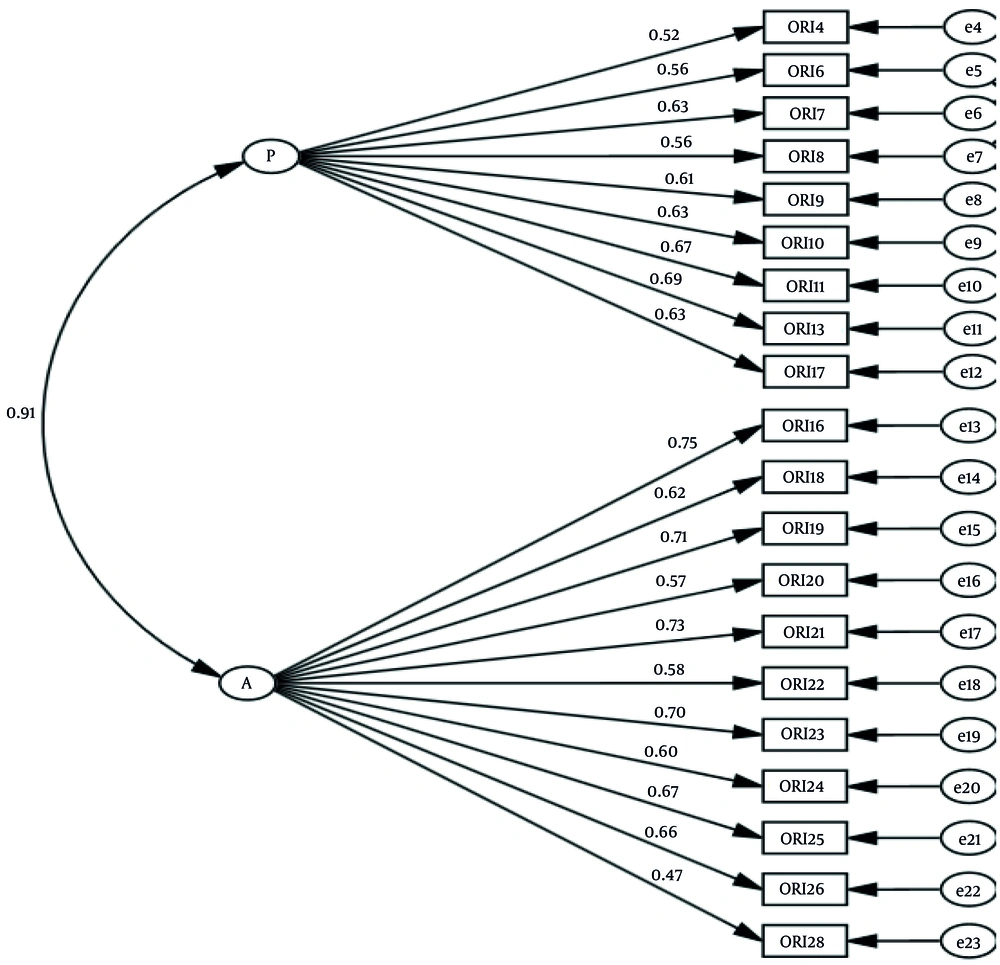 The translation procedure adhered to the guidelines outlined by Beaton et al. (18) for the cross-cultural adaptation of self-report instruments. This process included forward translation, synthesis, back-translation, expert committee review, and pretesting. Two independent bilingual translators participated in the forward translation from English to Persian — one familiar with the subject matter (a clinical psychologist) and the other unfamiliar with the concepts (a linguist). Discrepancies between translations were resolved through discussion, resulting in a synthesized version. This synthesized version was then back-translated into English by two different translators who were blinded to the original version. An expert committee — consisting of the translators, a methodologist, and two language professionals — reviewed all versions to ensure semantic, idiomatic, experiential, and conceptual equivalence. The pre-final Persian version of the ORI-VSF was piloted with 30 individuals to assess clarity, comprehensibility, and cultural relevance. Based on participant feedback, minor adjustments were made, and the final version was established.
