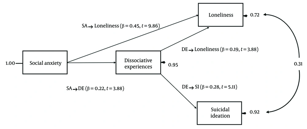 ![The diagram of direct paths with standard coefficients [chi-square: 2.87, df: 1, P: 0.00128, root mean square error of approximation (RMSEA): 0.074. Abbreviations: SA, social anxiety; DE, dissociative experiences; SI, suicidal ideation]. The diagram of direct paths with standard coefficients [chi-square: 2.87, df: 1, P: 0.00128, root mean square error of approximation (RMSEA): 0.074. Abbreviations: SA, social anxiety; DE, dissociative experiences; SI, suicidal ideation].](https://services.brieflands.com/cdn/serve/3170d/26a5249a6ffb9ba89839f4e6ed3ccf171a485589/ijpbs-19-3-158485-i002-preview.webp)