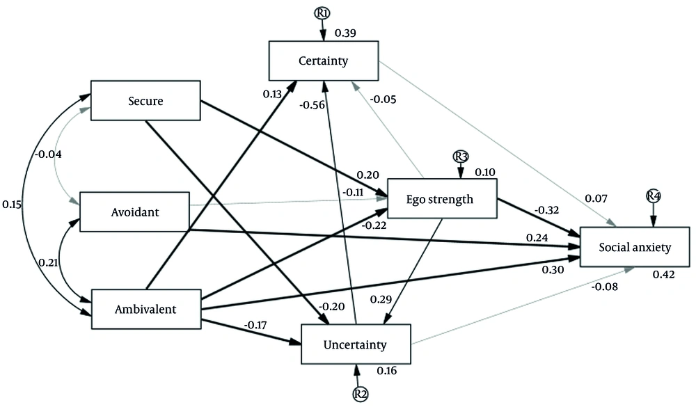 Based on the final path model, the following paths were not significant: Avoidant and secure attachment styles, avoidant attachment style to ego strength, ego strength to mentalization (certainty), mentalization (certainty) to social anxiety, and mentalization (uncertainty) to social anxiety. In contrast, ambivalent and secure attachment styles showed significant associations with ego strength; ego strength and secure and ambivalent attachment styles were significantly related to mentalization (uncertainty); ambivalent and avoidant attachment styles were directly associated with social anxiety; ambivalent attachment style showed a significant relationship with mentalization (certainty); and ego strength demonstrated a significant direct relationship with social anxiety.