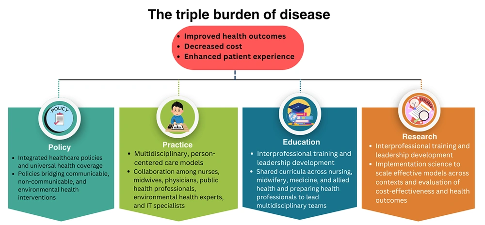 As shown in Figure 1, tackling the triple burden of disease requires coordinated action across four interconnected domains — policy, practice, education, and research. Policies that integrate communicable, non-communicable, mental health, and environmental health priorities set the foundation for equitable access to care. In practice, multidisciplinary, person-centered models bring together diverse professionals to deliver comprehensive services. Education builds interprofessional skills and leadership capacity, while research ensures that interventions are evidence-based, scalable, and responsive to emerging challenges. Collectively, these strategies drive improved health outcomes, lower costs, and enhance patient experiences.