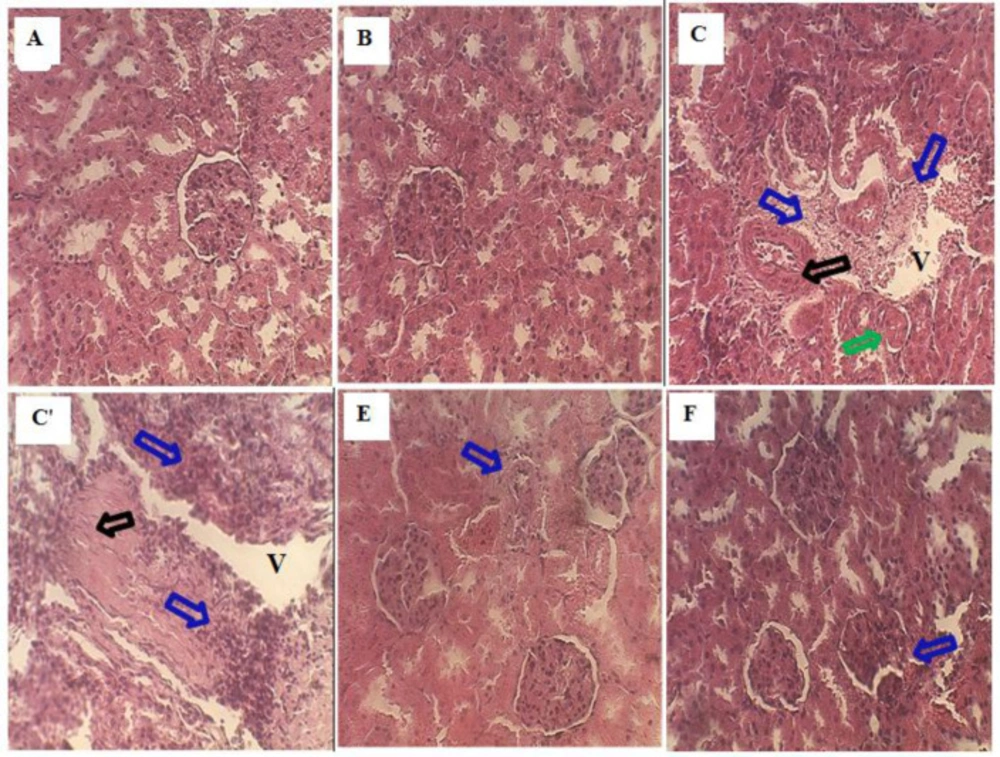 (A, ×40). The histological examination of the kidney from the control rat showed normal architecture. (B, ×40) The kidney section of A. halimus treated rats showed a healthy renal architecture. (C, C', ×40) Sodium benzoate treated rats' kidneys showed a Focus of inflammation (blue arrow), Glomerular necrosis (black arrow), Glomerular atrophy (green arrow) and vacuolation (V). Ah curative treated rat kidney showed a normal appearance of tubule and glomerulus and few inflammatory cellular infiltrations (blue arrow) (E, ×40). (F, ×40) Kidney sections of sodium benzoate rats prevented by A. halimus showed a moderate degree of kidney damage inflammatory cell, protection from tubule and glomerulus degradation