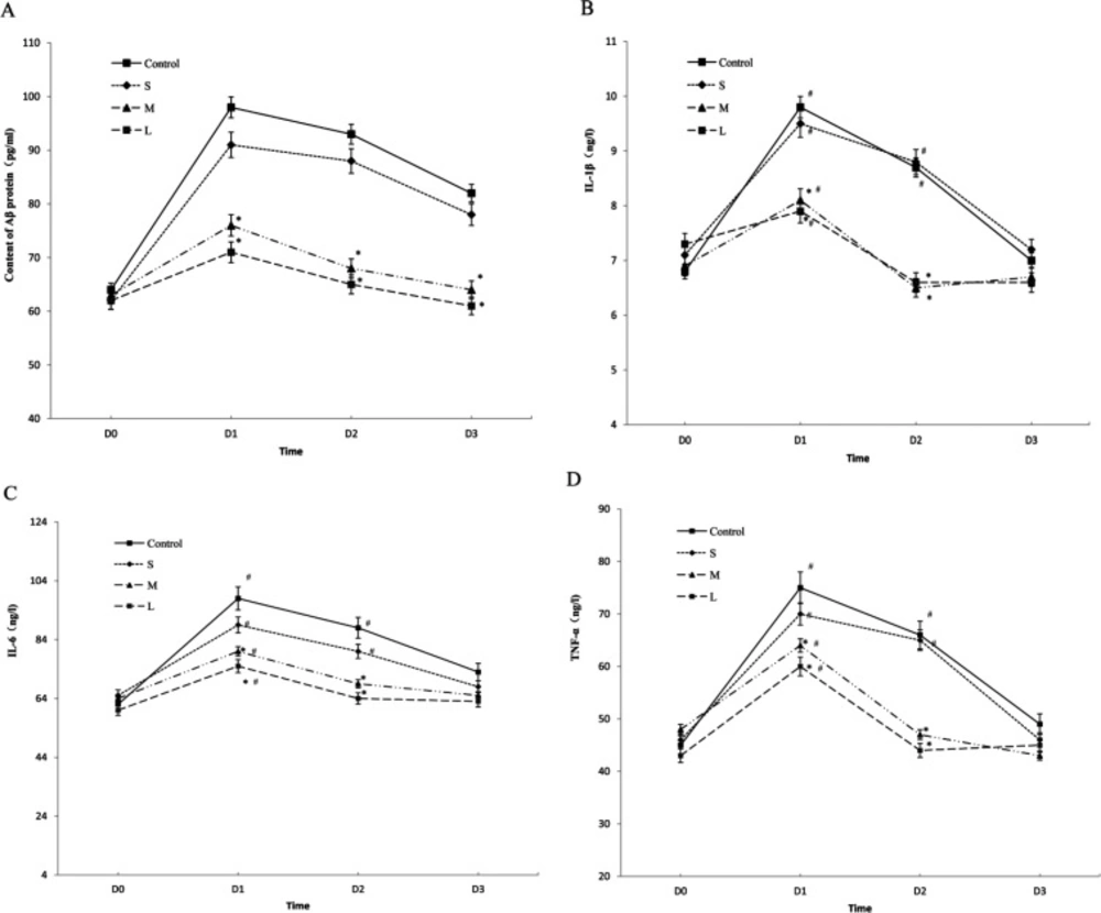 Overall, Compared with the control group,the serum levels of β-amyloid, TNF-α, L1β and IL6 were significantly lower in the group M and L (P < 0.01) at time points (day 1, day 3 after the operation) with a pairwise comparison, while there was no significant difference in the group S (P > 0.05).