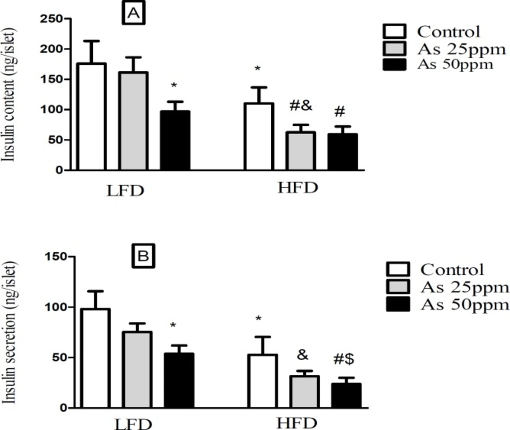 Effect of diet and As exposure on insulin secretion and content of pancreatic islets in control LFD or HFD fed and As 25 or 50 treated LFD or HFD mice (A) Insulin content; (B) Insulin secretion. Values represented as mean ± SD (n = 12, for A-B). *: Significantly different from LFD, #: Significantly different from HFD, &: Significantly different from LFD + As 25 ppm, $: Significantly different from LFD + As 50 ppm. *, #, & and $ p < 0.05