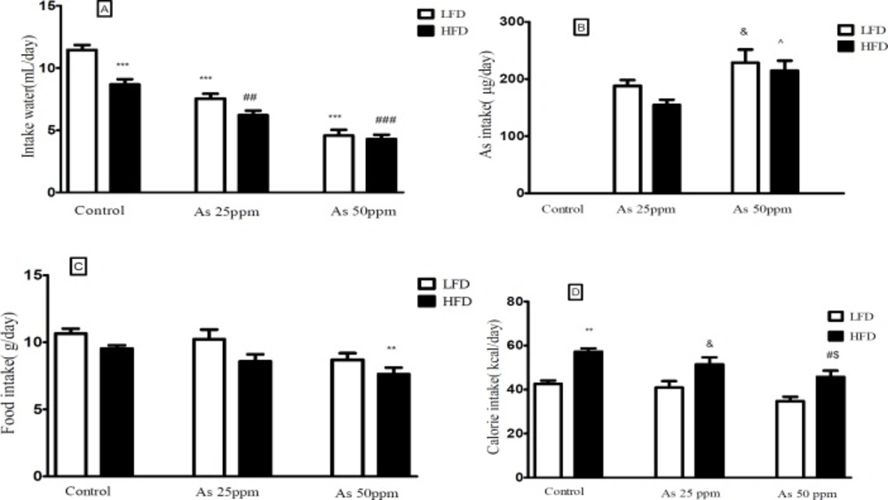 A) Intakes of water, (B) As, (C) food, and (D) calories by control LFD or HFD fed and As 25 or 50 treated LFD or HFD mice. Values represented as mean ± SD (n = 12, for A-D).*: Significantly different from LFD, #: Significantly different from HFD, &: Significantly different from LFD + As 25 ppm, ^: Significantly different from HFD + As 25 ppm, $: Significantly different from LFD + As 50 ppm. *, #, &, ^ and $ p < 0.05, ** and ## p < 0.01, *** and ### p < 0.001