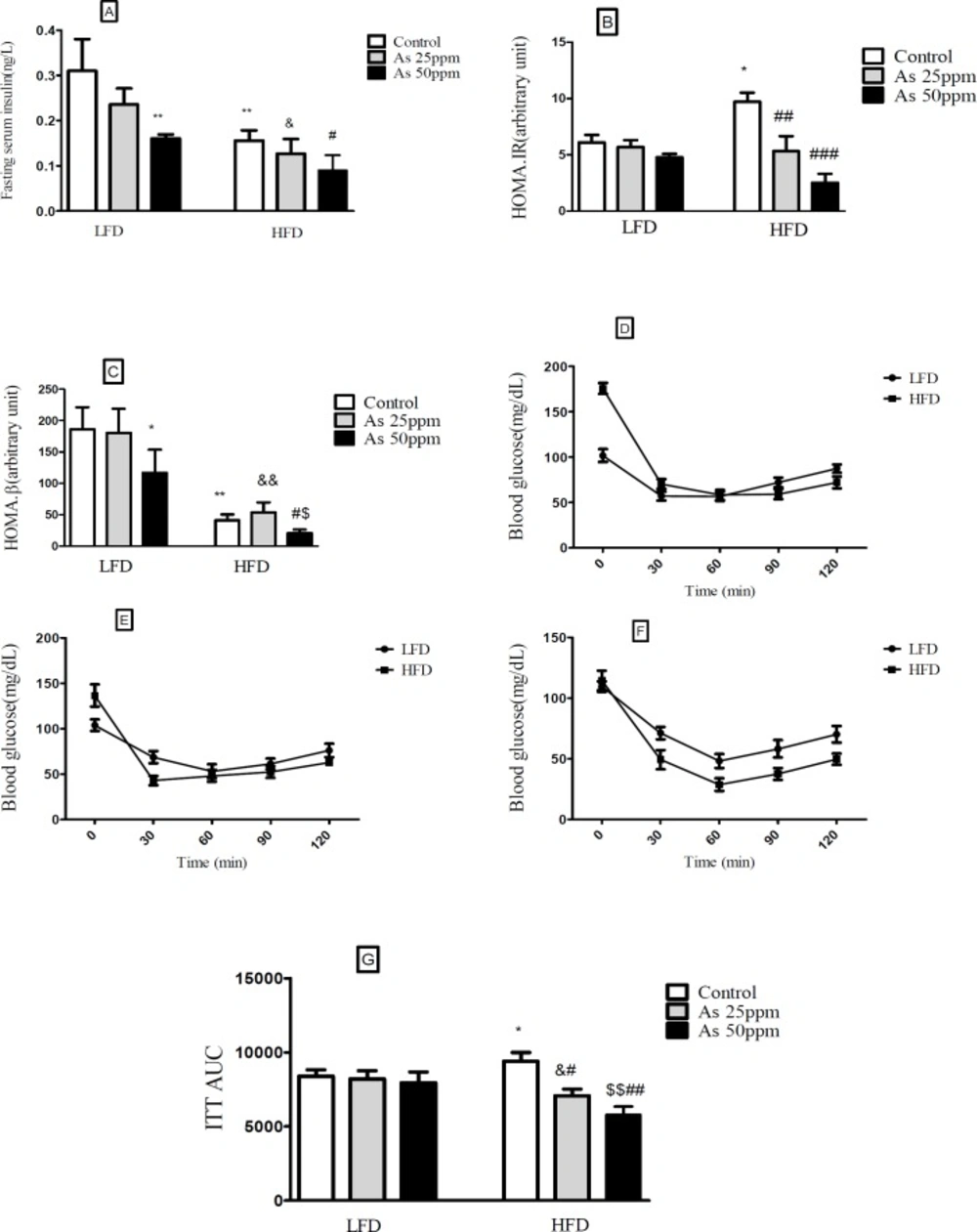 Effects of As exposure on glucose and insulin tolerance in control LFD or HFD fed and As 25 or 50 treated LFD or HFD mice (A) Fasting plasma insulin; (B) HOMA-IR; (C) HOMA-β; (D) ITT results for control mice; (E) ITT results for mice exposed to As 25 ppm; (F) ITT results for mice exposed to As 50 ppm (G) ITT AUC, calculated according to ITT calculated. Values represented as mean ± SD (n = 12, for A-G). *: Significantly different from LFD, #: Significantly different from HFD, &: Significantly different from LFD + As 25 ppm, $: Significantly different from LFD + As 50 ppm. * #, & and $ p < 0.05, **, ##, && and $$ p < 0.01, ### p < 0.001