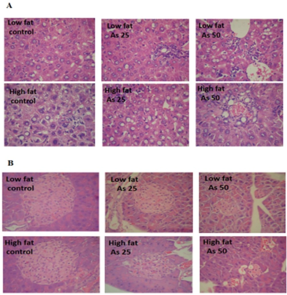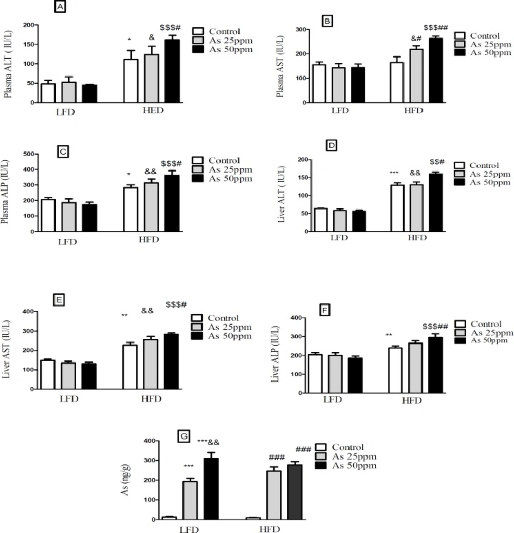 The liver is an essential tissue that performed a wide range of biochemical, metabolic, and drug metabolites (51). AST, ALT, and ALP enzymes are livers biomarker associated with liver dysfunction or damage (52). The cytosolic leakage of AST and ALT has been occurred into the blood stream through the liver parenchymal injury, and increase the plasma levels of these enzymes. Some research showed a significant hepatic enzymes enhancement in HFD and arsenic treated rats (50). So, in accordance with previous studies it could be suggested that HFD and arsenic administration induced hepatotoxicity via increase oxidative stress and plasma or liver levels of ALT, AST, and ALP.
