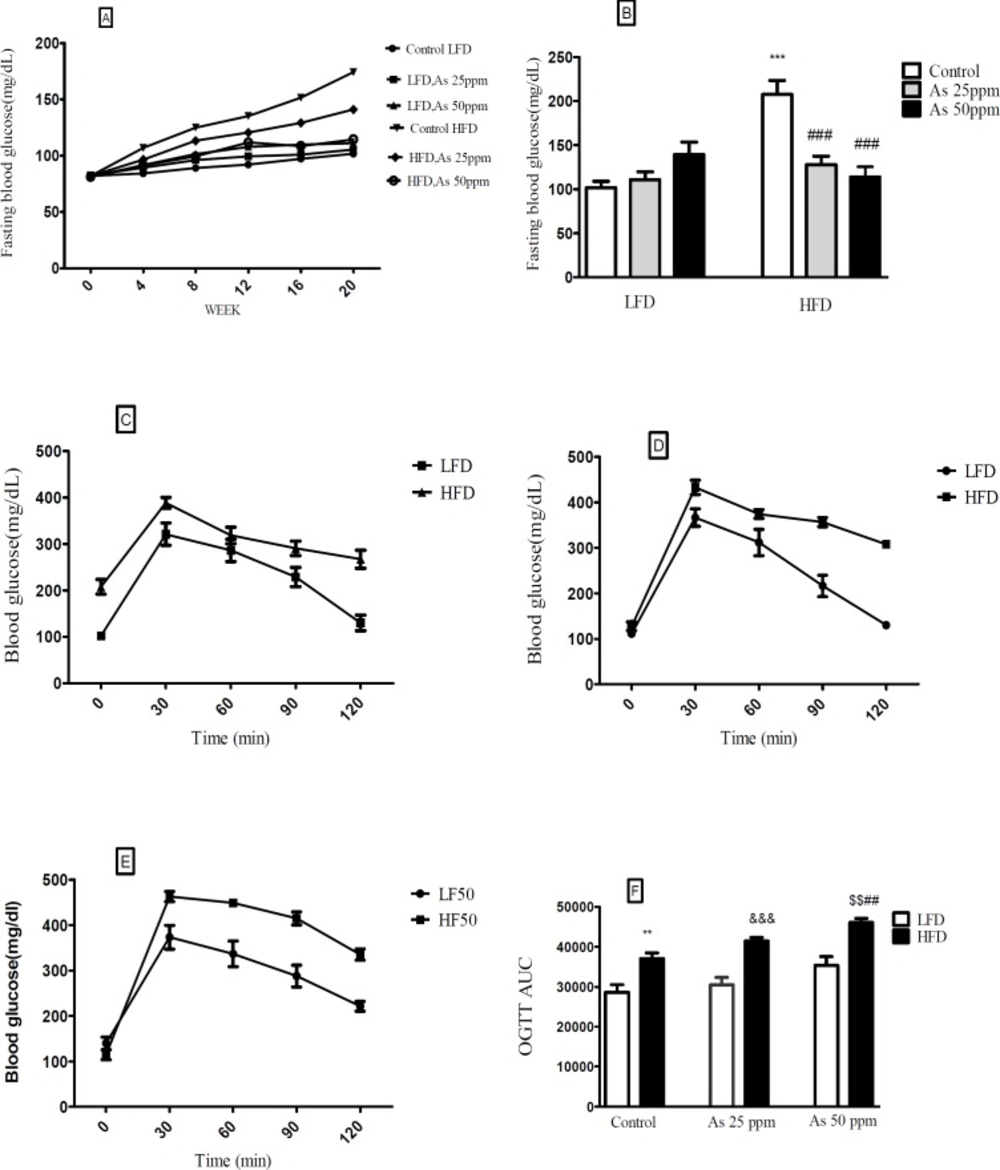 The results of OGTT AUC indicated that HFD could enhance glucose tolerance in mice and arsenic consumption aggravate that in a concentration dependent manner. Hence, as shown in the previous study, the present data suggest that exposure to HFD consumption and As may induced diabetes differ from type 2 diabetes which is characterized by fasting hyperglycemia and impaired glucose tolerance.