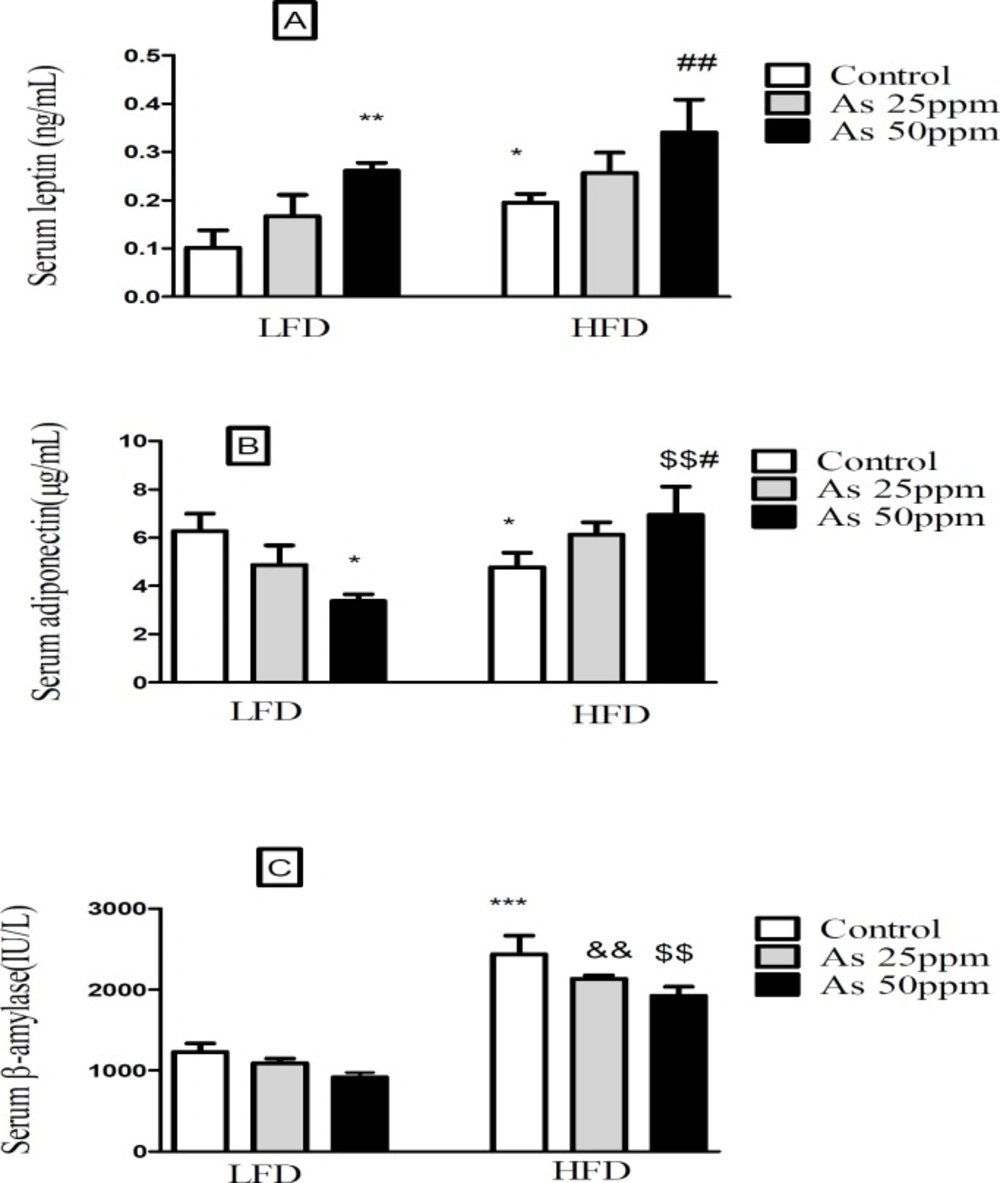 Effects of As and diet on (A) plasma leptin levels; (B) plasma adiponectin levels and (C) plasma β amylase levels in control LFD or HFD fed and As 25 or 50 treated LFD or HFD mice. Values represented as mean ± SD (n = 12, for A-C). *: Significantly different from LFD, #: Significantly different from HFD, &: Significantly different from LFD + As 25 ppm, $: Significantly different from LFD + As 50 ppm. * and # p < 0.05, **, ##, && and $$ p < 0.01, *** p < 0.001