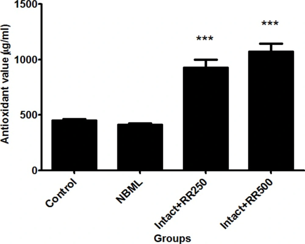 Figure 3 shows the level of antioxidants in blood serum in control, NBML and both groups of intact rats receiving 250 and 500 mg/kg RR extracts. The level of antioxidants was markedly increased in Intact + RR250 and Intact + RR500 groups compared to the control group (p < 0.001).
