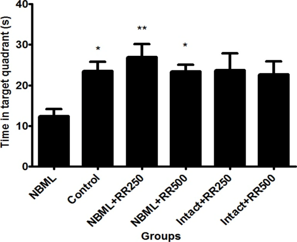 Effect of RR extracts on short-term memory was evaluated by performing probe trial experiment using Morris water maze task. Data collected from probe trial experiment revealed that NBM-lesioned rats (NBML) spent significantly less time in target quadrant in which the platform was located in the preceding day compared with control group (P < 0.05, Figure 2). Interestingly, time spent in target quadrant was significantly increased in both NBML groups which received RR extracts (NBML + RR250 and NBML + RR500) when it was compared with the NBML group (p < 0.05 and p < 0.01, respectively). No significant differences were observed between intact animals receiving RR extracts (Intact + RR250 and Intact + RR500) and the control group (p > 0.05).