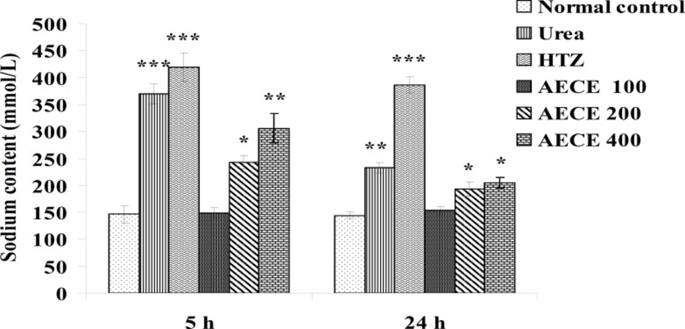 The administration of urea (1 g/Kg, p.o.) and hydrochlorothiazide (10 mg/Kg, p.o.) showed significant (p < 0.001) increase in sodium content of urine as compared with the normal control group at 5 h. The administration of AECE (200 and 400 mg/Kg, p.o.) showed significant (p < 0.05 and p < 0.01 respectively) increase in sodium content of urine as compared with normal control group at 5 h.