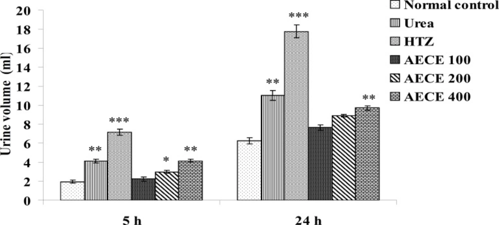 The administration of AECE (200 and 400 mg/Kg) showed significant (p < 0.05 and p < 0.01 respectively) increase in urine volume as compared with normal control group at 5 h. AECE (100 mg/Kg) showed insignificant effects in this regard.
