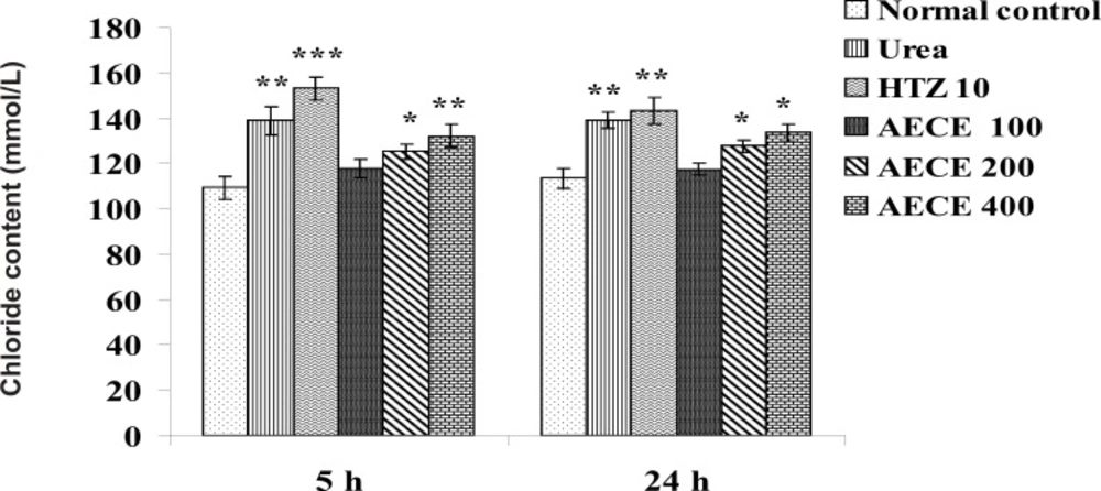 The administration of urea (1 g/Kg, p.o.) and hydrochlorothiazide (10 mg/Kg, p.o.) showed significant (p < 0.01 for both) increase in chloride content of urine as compared with the normal control group at 5 h. The administration of AECE (200 and 400 mg/Kg, p.o.) showed significant (p < 0.05 and p < 0.01 respectively) increase in chloride content of urine as compared with the normal control at 5 h.
