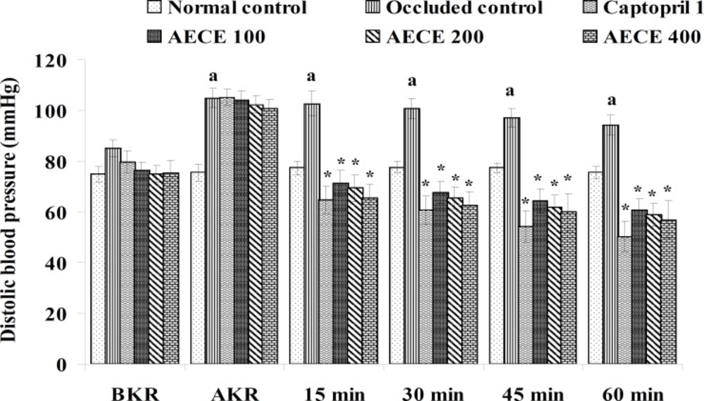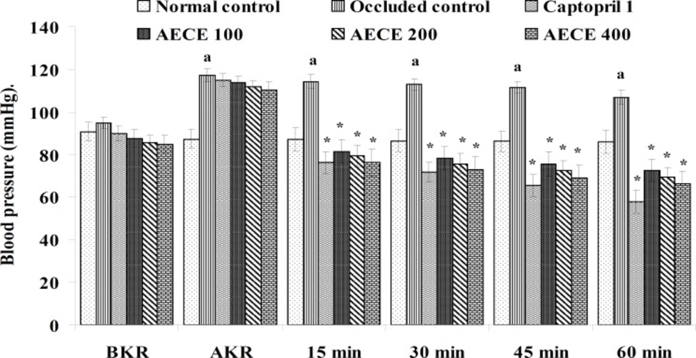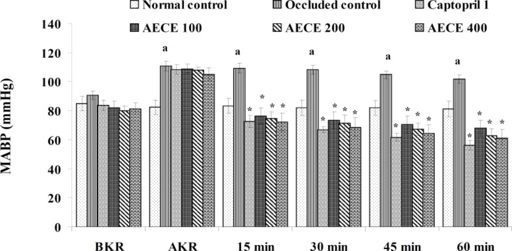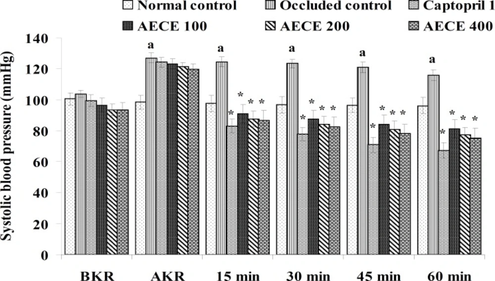 Normal control group: distilled water (10 mL/Kg, p.o.); occluded control group: distilled water (10 mL/Kg/p.o.); captopril 1: captopril (1 mg/Kg, IV) on day of experiment; AECE 100, 200, and 400 groups: AECE (100, 200, and 400 mg/Kg/day, p.o.) for 6 weeks and AECE (10, 20, and 40 mg/Kg, IV) on the day of experiment respectively.