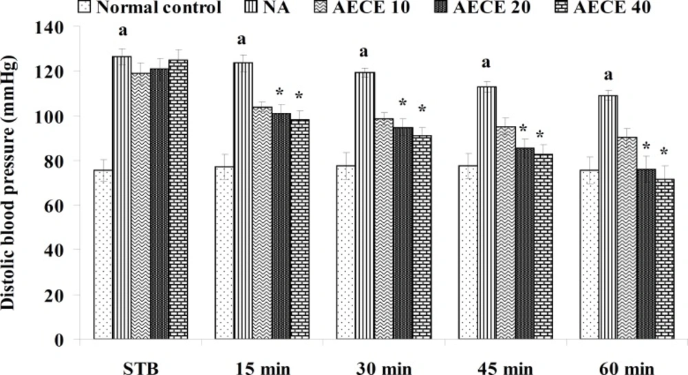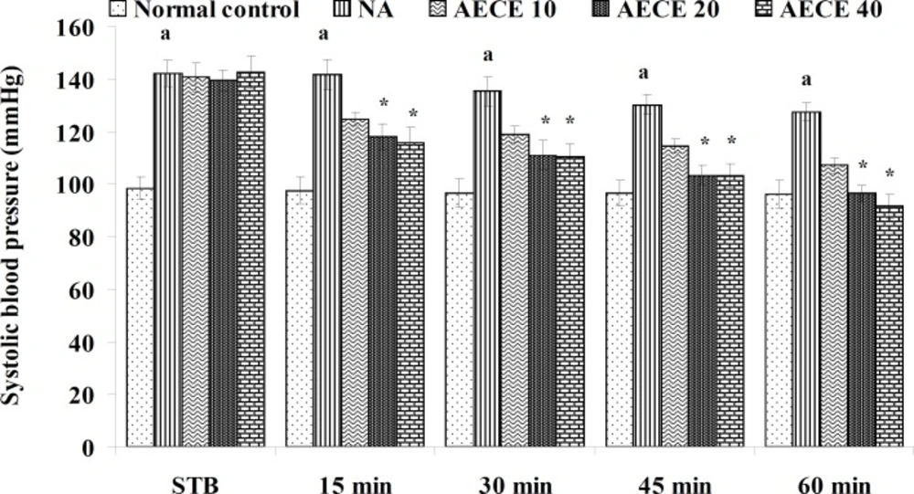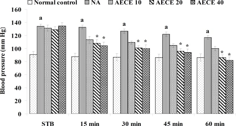 Normal control group: distilled water (1 mL/Kg, IV); NA (noradrenaline) group: distilled water (1 mL/Kg, IV); AECE 10, 20, and 40 groups: AECE (10, 20, and 40 mg/Kg, IV) on the day of experiment respectively. Animals were anaesthetized using urethane (1.25 g/Kg, IP). The jugular vein was cannulated for the drug treatments. The carotid artery was cannulated and connected to the POWER LAB (8/30, AD Instruments, Australia) through the pressure transducer. To the animals from all groups, except normal control group, noradrenaline (1 μg/Kg, IV) was administered through jugular vein for the induction of hypertension. Then, after the stabilisation of BP for 10 min, the respective treatments were given. The parameters like BP, SBP, DBP, and MABP were recorded for each animal after stabilisation of BP (STB) and at 15, 30, 45, and 60 min after the IV treatments (29, 30).