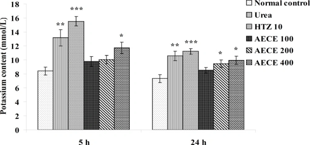 The administration of urea (1 g/Kg, p.o.) and hydrochlorothiazide (10 mg/Kg, p.o.) showed significant (p < 0.01 and p < 0.001 respectively) increase in potassium content of urine as compared with the normal control group at 5 h and 24 h. The administration of AECE (400 mg/Kg, p.o.) showed significant (p < 0.05) increase in potassium content of urine as compared with the normal control at 5 h and 24 h. The administration of AECE (200 and 400 mg/Kg, p.o.) showed significant (p < 0.05) increase in potassium content of urine as compared with the normal control group at 24 h. AECE (100 mg/Kg) showed insignificant effects in this regard at 5 h and 24 h (Figure 12).