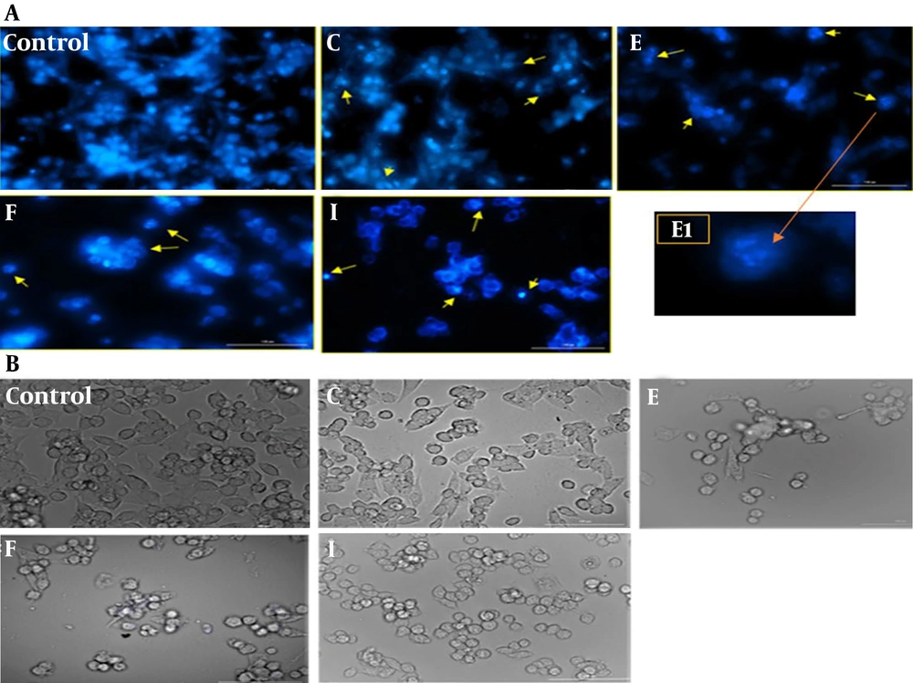 In the next stage of our experiment, to confirm the induction of apoptosis by the active fractions, the morphological changes of A2780 cells were assayed using DAPI dye (16). Briefly, the cells were incubated for 24 hours in a humidified atmosphere of 5% CO2 at 37°C with the IC50 concentration of active fractions (C, E, F, and I). At the end of the incubation, cells were stained using DAPI in PBS (2.5 μg/mL) for 10 minutes at room temperature in a dark condition. Finally, the stained cells were washed with PBS, and the nuclear morphological changes were viewed at tenfold magnification by BioTek Cytation 5 cell imaging multimode reader.