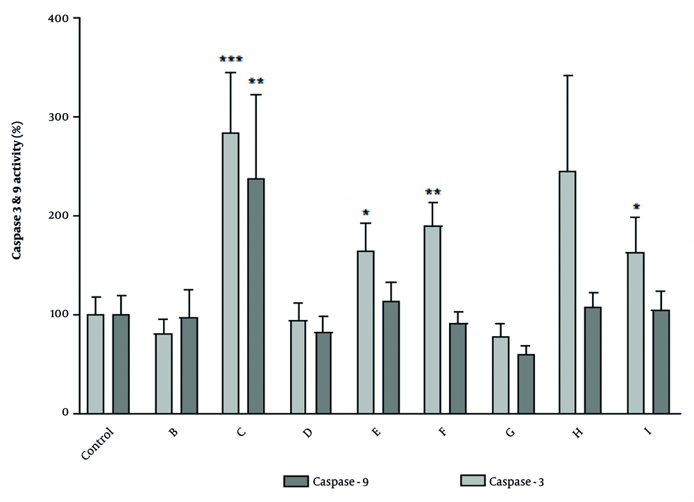In this experiment, the activity of caspase-3 and -9 enzymes was studied using colorimetric caspase-3 and -9 kits (Sigma, USA). For this purpose, apoptosis was induced in the cell lines using the IC50 concentration of selected fractions. Briefly, after 24 hours, lysis buffer was added to cells, and then the lysed cells were centrifuged at 16,000 - 20,000g for 10 - 15 minutes at 4°C, and the supernatants were transferred to new microtubes. Next, the samples were incubated with the substrate of caspase-3 (DEVD pNA) and caspase-9 (LEHD pNA) at 37°C for 2 hours. Finally, the release of p-nitroaniline was measured using a microplate reader (BioTek, H1M) at 405 nm. The protein content was determined by the Bradford assay.