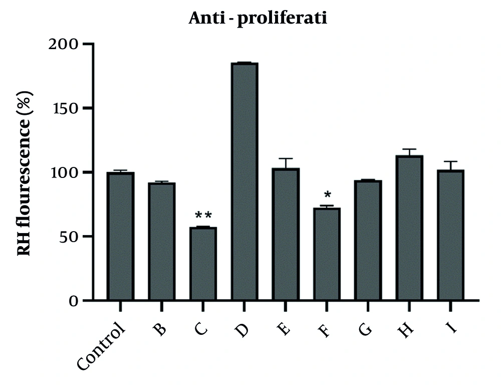 One of the important factors involved in inducing apoptosis through the intrinsic pathway is mitochondrial membrane potential (MMP). In this study, MMP was assessed by rhodamine 123 as a fluorescent cationic dye. Rhodamine and its derivatives are fluorescent cationic lipophilic dyes that penetrate the cell, and the intensity of their fluorescence is indicative of the amount of change in MMP (14). For this purpose, the most sensitive cell line, A2780, was treated with the IC50concentration of the selected fractions in 6-well plates for 24 hours. At the end of treatment, cells were incubated with rhodamine 123 (15 μL, 20 μM) for 30 minutes at 37°C. Thereafter, the fluorescence of lysed cells by Triton™ X100 was measured at an excitation wavelength of 488 nm and an emission wavelength of 590 nm using a fluorescence microplate reader (BioTek, H1 M, USA). The Bradford assay was also used for the determination of protein content of each sample (15).