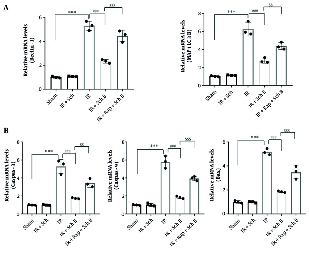 The expression levels of damage-related genes (caspase-3, caspase-9, Bax) were quantified using qPCR. Compared to the IR + vehicle group, the mRNA expression levels of caspase-3, caspase-9, and Bax were significantly reduced in the IR + Sch B group. Similarly, the mRNA levels of these genes were also significantly decreased in the IR + Sch B + Rap group. In contrast, when compared to the IR + Sch B group, the mRNA levels of Beclin-1 and MAP1LC3B were significantly elevated in the IR + Sch B + Rap group, accompanied by a significant increase in the expression of injury-related genes (caspase-3, caspase-9, Bax) (Figure 4A and B).