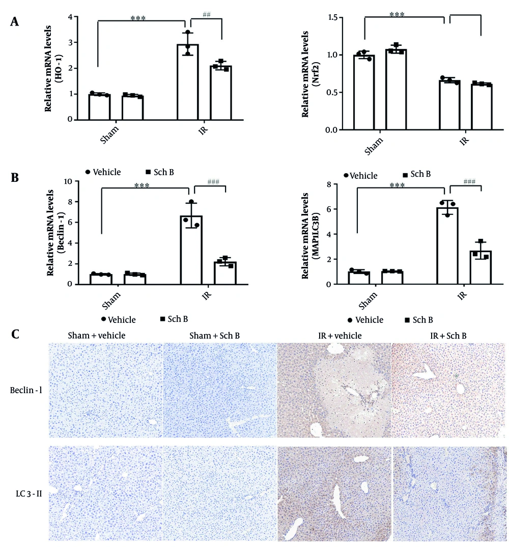 Effects of schisandrin B (Sch B) on oxidative stress and cellular autophagy in mice. A, Quantitative polymerase chain reaction (qPCR) detection of mRNA levels of oxidative stress-related factors HO-1 and nuclear factor erythroid 2-related factor 2 (Nrf2) in liver tissues (n = 3), The results of one-way analysis of variance (ANOVA) for HO-1 and Nrf2 were F (DFn, DFd) = F (3, 8) = 50.87, P < 0.0001 and F (3, 8) = 99.61, P < 0.0001, respectively; B, quantitative polymerase chain reaction detection of mRNA levels of cellular autophagy-related factors Beclin-1, microtubule-associated protein 1 light chain 3 beta (MAP1LC3B) in liver tissues (n = 3), The results of one-way ANOVA for Beclin-1 and MAP1LC3B were F (DFn, DFd) = F (3, 8) = 54.55, P < 0.0001 and F (3, 8) = 88.96, P < 0.0001, respectively; C, immunohistochemical detection of cellular autophagy-related factors Beclin-1, LC3-II (200×). Data are mean ± standard deviation. IR + Vehicle vs Sham + Vehicle. *** P < 0.001; IR + Sch B vs IR + Vehicle. ## P < 0.01, ### P < 0.001; Abbreviation: n.s, no significant difference.