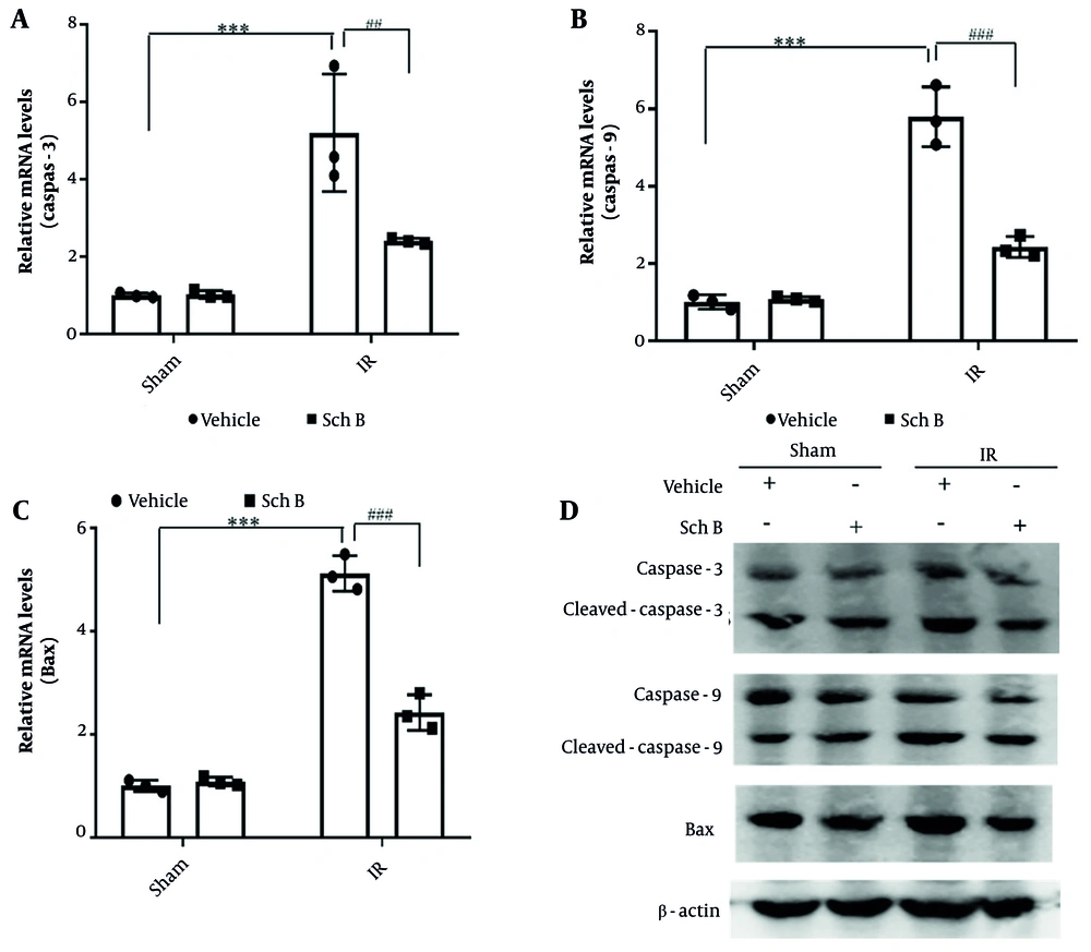 Effect of schisandrin B (Sch B) on hepatocyte injury in mice. A - C, Quantitative polymerase chain reaction (qPCR) detection of mRNA levels of caspase-3, caspase-9, and Bax in liver tissues (n = 3), The results of one-way analysis of variance (ANOVA) for caspase-3, caspase-9, and Bax were F (DFn, DFd) = F (3, 8) = 20.08, P < 0.0004, F (3, 8) = 85.18, P < 0.0001, and F (3, 8) = 172.9, P < 0.0001, respectively; D, immunoblotting for protein levels of caspase-3, caspase-9, and Bax in liver tissues. Data are mean ± standard deviation. IR + Vehicle compared with Sham + Vehicle. *** P < 0.001; IR + Sch B compared with IR + Vehicle, ## P < 0.01, ### P < 0.001.
