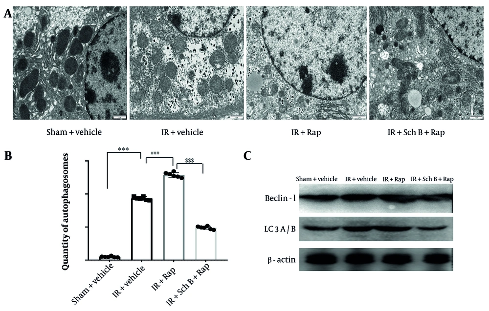 The formation of autophagic vesicles in each experimental group was examined using electron microscopy. The results indicated a significant increase in autophagic vesicles in the IR + Rap group compared to the IR group (Figure 5A and B). Conversely, a significant reduction in autophagic vesicles was observed in the IR + Sch B + Rap group relative to the IR + Rap group (Figure 5A and B).