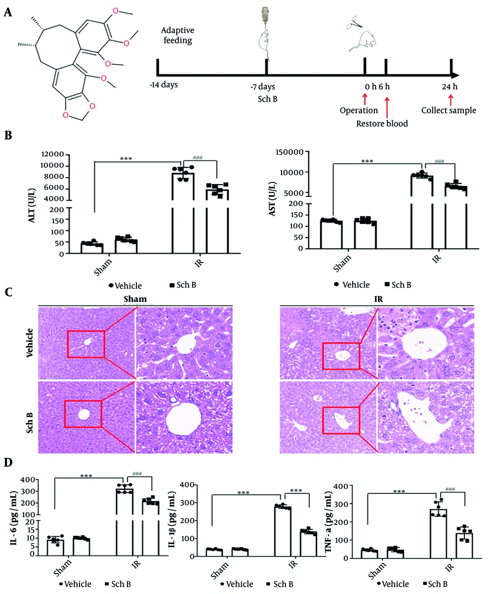Protective effect of schisandrin B (Sch B) against liver ischemia-reperfusion (IR) injury in mice. A, Schematic diagram of the chemical structure and animal experimental procedure of Sch B; B, serum alanine aminotransferase (ALT) and aspartate aminotransferase (AST) levels (n = 6), The results of one-way analysis of variance (ANOVA) for ALT and AST were F (DFn, DFd) = F (3, 20) = 274.5, P < 0.0001 and F (3, 20) = 624.6, P < 0.0001, respectively; C, representative HE-stained liver sections (200X or 400X) under digital microscope; D, serum interleukin-1β (IL-1β), IL-6, TNF-a levels (n = 6). The results of one-way ANOVA for IL-1β, IL-6, and TNF-a were F (DFn, DFd) = F (3, 20) = 343.7, P < 0.0001, F (3, 20) = 1098, P < 0.0001, and F (3, 20) = 94.50, P < 0.0001, respectively. Data are mean ± standard deviation. Ischemia-reperfusion + Vehicle vs. Sham + Vehicle. *** P < 0.001; IR + Sch B vs. IR + Vehicle, ### P < 0.001.