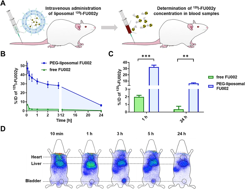 Pharmacokinetic and biodistribution studies of FU002-loaded PEGylated liposomes: A, intravenous injection of liposomal125I-FU002y in Wistar rats; B, time course of liposomal 125I-FU002y blood levels (blue) compared to free 125I-FU002y (green); C, compared to free 125I-FU002y (green), a 16-fold increase in blood levels of 125I-FU002y for the liposomal formulation (blue) was observed for 1 h and 24 h post-injection; D, scintigraphic images were acquired at five time points after intravenous injection of liposomal 125I-FU002y (64) (reprinted from an open access journal under the Creative Commons CC-BY license: https://creativecommons.org/licenses/by/4.0/). Statistically analyzed with unpaired t-test: ** P ≤ 0.01, *** P ≤ 0.001.
