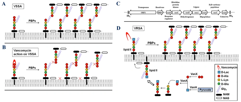 Mechanism of vancomycin resistance: A, normal peptidoglycan synthesis in vancomycin-sensitive Staphylococcus aureus (VSSA); B, vancomycin action on the cell wall in VSSA; C, structure of the VanA gene cluster; D, mechanism of resistance in vancomycin-resistant Staphylococcus aureus (VRSA) (abbreviations: D-lac, D-lactate; Gly5, Pentaglycine; NAM, N-acetylmuramic acid; and NAG, N-acetylglucosamine (44); reprinted from an open access journal under the Creative Commons CC-BY license: https://creativecommons.org/licenses/by/4.0/).