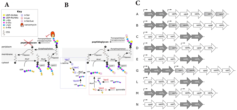 Mechanism of vancomycin resistance in Enterococci: A, in sensitive Enterococci, vancomycin attaches to the D-Ala-D-Ala terminus of the muramyl pentapeptide and disrupts the proper cross-linking of the cell wall's peptidoglycan layer; B, ithe D-Ala-D-Ala structure is altered to D-Ala-D-Ser or D-Ala-D-Lac in vancomycin-resistant Enterococci (VRE), which vancomycin cannot recognize; C, the structure of gene clusters conferring vancomycin resistance in Enterococci types A - N is outlined. Regulatory genes: Dark gray, remodeling genes: White, and accessory genes: Varying shades of gray, arrows indicate the approximate locations of promoters (39) (reprinted from an open access journal under the Creative Commons CC-BY license: https://creativecommons.org/licenses/by/4.0/).