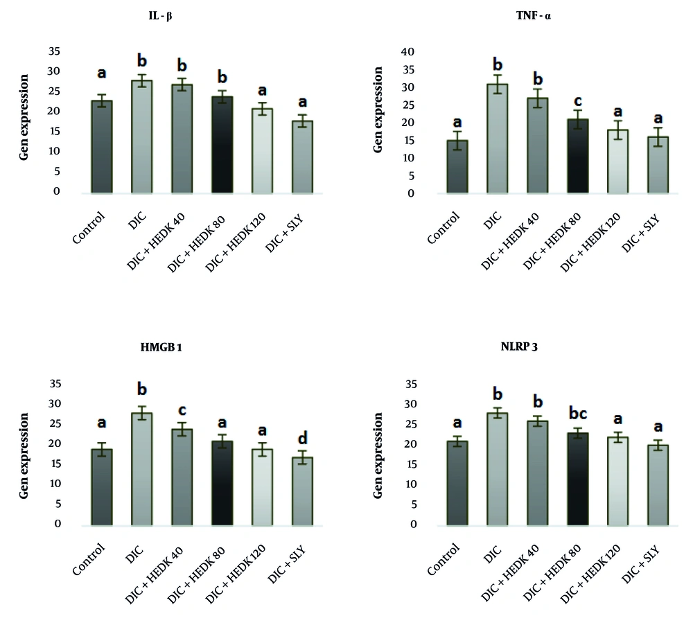 ![Analysis of liver proinflammatory markers; the effects of diclofenac (DIC), hydroalcoholic extract of <i>Dracocephalum kotschyi</i> (HEDK), and silymarin (SLY) on interleukin 1 beta (IL-1β), tumor necrosis factor α (TNF-α), NOD-like receptor protein 3 (NLRP3), and high-mobility group box 1 (HMGB1) gene expression [the data are expressed as the means ± standard deviation (SD)]; Based on Tukey’s HSD test, groups sharing at least one common letter are not significantly different from each other (P < 0.05). Analysis of liver proinflammatory markers; the effects of diclofenac (DIC), hydroalcoholic extract of <i>Dracocephalum kotschyi</i> (HEDK), and silymarin (SLY) on interleukin 1 beta (IL-1β), tumor necrosis factor α (TNF-α), NOD-like receptor protein 3 (NLRP3), and high-mobility group box 1 (HMGB1) gene expression [the data are expressed as the means ± standard deviation (SD)]; Based on Tukey’s HSD test, groups sharing at least one common letter are not significantly different from each other (P < 0.05).](https://services.brieflands.com/cdn/serve/3170d/2f1549ea0997c81192f5b1d35315c1efd8219263/ijpr-24-1-162656-i003-preview.webp)