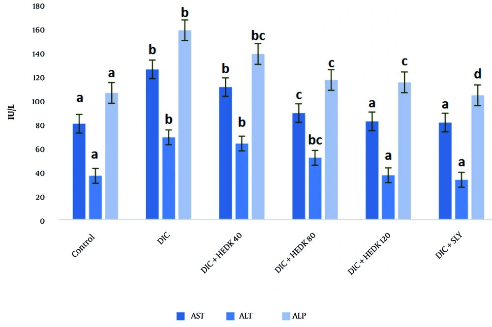 Compared to the control group, the AST, ALT, and ALP levels increased significantly after DIC administration. The HEDK reduced the target enzymes' levels dose-dependently and showed better results than SLY. The levels of these enzymes in the HEDK120 and SLY groups did not have a significant difference in comparison to the control group (Figure 1).