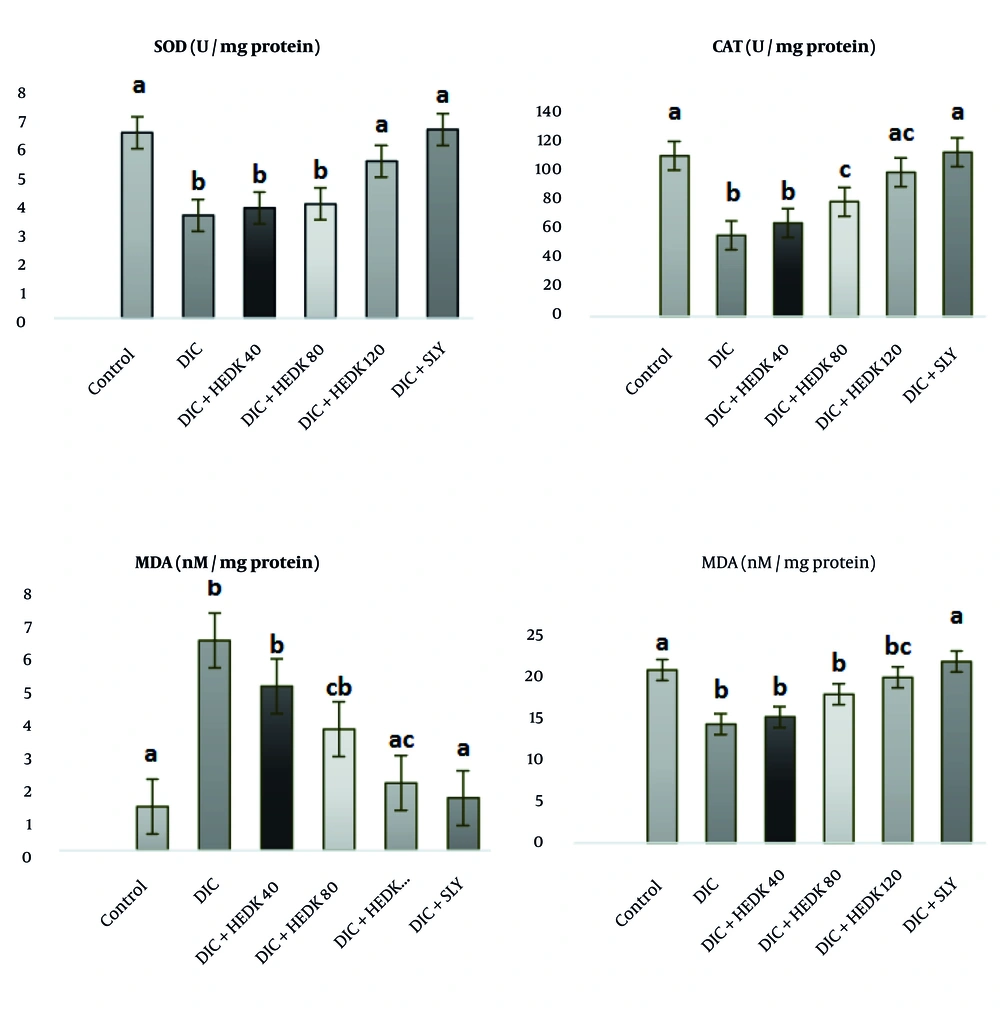 ![The effects of diclofenac (DIC), hydroalcoholic extract of <i>Dracocephalum kotschyi</i> (HEDK), and silymarin (SLY) on superoxide dismutase (SOD), catalase (CAT), GSH, and malondialdehyde (MDA) levels in the groups [the data are expressed as the means ± standard deviation (SD)]; Based on Tukey’s HSD test, groups sharing at least one common letter are not significantly different from each other P < 0.05). The effects of diclofenac (DIC), hydroalcoholic extract of <i>Dracocephalum kotschyi</i> (HEDK), and silymarin (SLY) on superoxide dismutase (SOD), catalase (CAT), GSH, and malondialdehyde (MDA) levels in the groups [the data are expressed as the means ± standard deviation (SD)]; Based on Tukey’s HSD test, groups sharing at least one common letter are not significantly different from each other P < 0.05).](https://services.brieflands.com/cdn/serve/3170d/f245e9032f25caa10d1fd67eaecd127f1245b637/ijpr-24-1-162656-i002-preview.webp)
