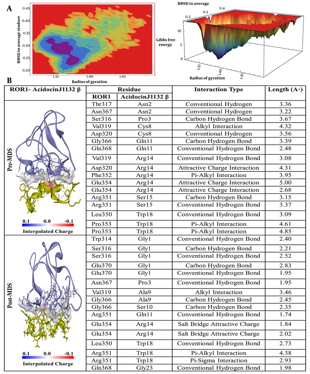 A, Free energy landscape (FEL) analysis for the receptor tyrosine kinase-like orphan receptor 1 (ROR1)-Acidocin J1132 β complex, showing the most stable conformational states during molecular dynamics (MD)simulations; B, interaction details of Acidocin J1132 β with ROR1 before (pre-MD) and after (post-MD) MD simulations.