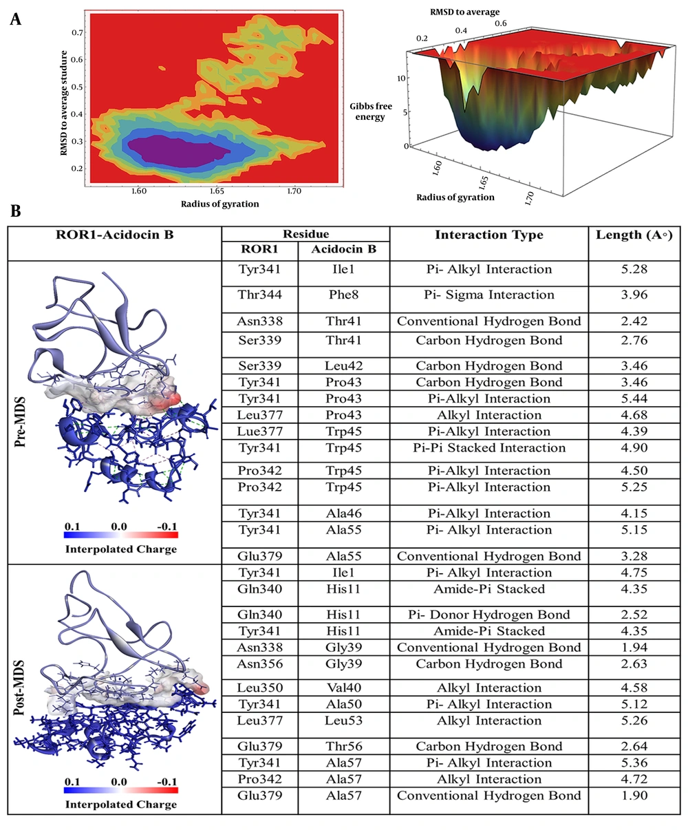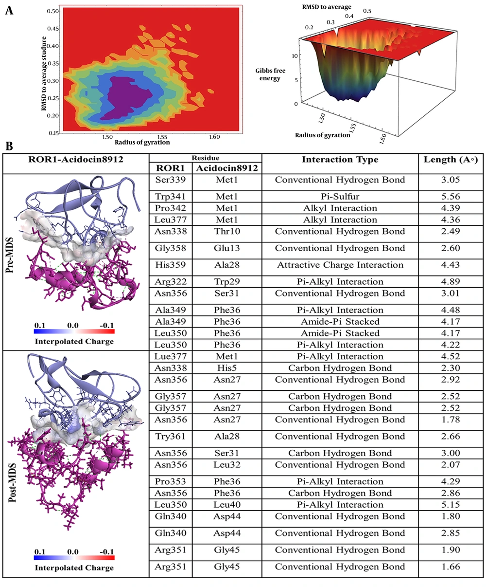 A, Free energy landscape (FEL) analysis for the receptor tyrosine kinase-like orphan receptor 1 (ROR1)-Acidocin B complex, showing the most stable conformational states during molecular dynamics (MD) simulations; B, interaction details of Acidocin B with ROR1 before (pre-MD) and after (post-MD) MD simulations.