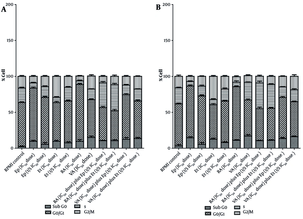 ![The impact of epirubicin (Ep) and etoposide (Et) at different concentrations (IC<sub>50</sub> and 1/5 IC<sub>50</sub> doses), both alone and in combination with retinoic acid (RA) and valproic acid (VA), on the distribution of cell cycle in the A, B-CPAP and B, SW cell lines was assessed after a 48-hour incubation period [the data is expressed as the mean ± standard deviation; significant differences (* P < 0.05) were observed compared to the control group treated with RPMI]. The impact of epirubicin (Ep) and etoposide (Et) at different concentrations (IC<sub>50</sub> and 1/5 IC<sub>50</sub> doses), both alone and in combination with retinoic acid (RA) and valproic acid (VA), on the distribution of cell cycle in the A, B-CPAP and B, SW cell lines was assessed after a 48-hour incubation period [the data is expressed as the mean ± standard deviation; significant differences (* P < 0.05) were observed compared to the control group treated with RPMI].](https://services.brieflands.com/cdn/serve/3170d/00b30e22d68a4c3a518bbb5db71aa2a52e271a43/ijpr-24-1-163580-i005-preview.webp)