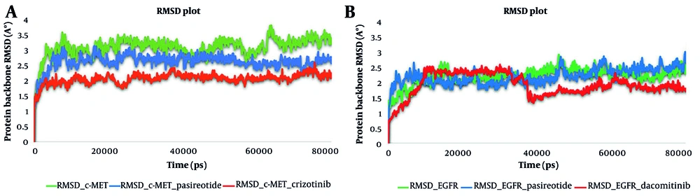 The MD simulation analysis was carried out on pasireotide based on its favorable binding affinity compared to other hit compounds. Its interaction profile suggests that it could effectively inhibit the active sites of c-MET and EGFR. To investigate the stability of the modeled systems, the dynamic behavior of the optimal IFD pose of pasireotide at c-MET and EGFR active sites was compared with the dynamic action of crizotinib and dacomitinib, the standard inhibitors of the c-MET and EGFR kinase domains, respectively, over approximately 80 ns of MD simulation to predict the motion of complex systems at an atomistic level. The RMSD values serve as indicators of the system’s conformational stability and perturbations (53).