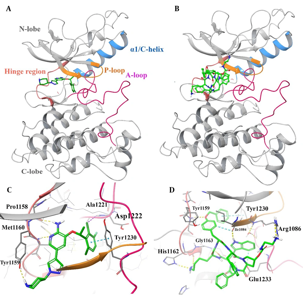 The 3D representation of the top-ranked hit, "pasireotide", over the active site of c-MET was employed to depict all the essential interactions in comparison to crizotinib as an approved c-MET inhibitor (Figure 2). Based on the observation, pasireotide does indeed bind to the ATP site of the c-MET active site, similar to crizotinib, which is surrounded by the hinge region (residues 1157 - 1164), P-loop (residues 1085 - 1090), A-loop (residues 1221 - 1251), and Cα helix (residues 1062 - 1131; Figure 2A and B).