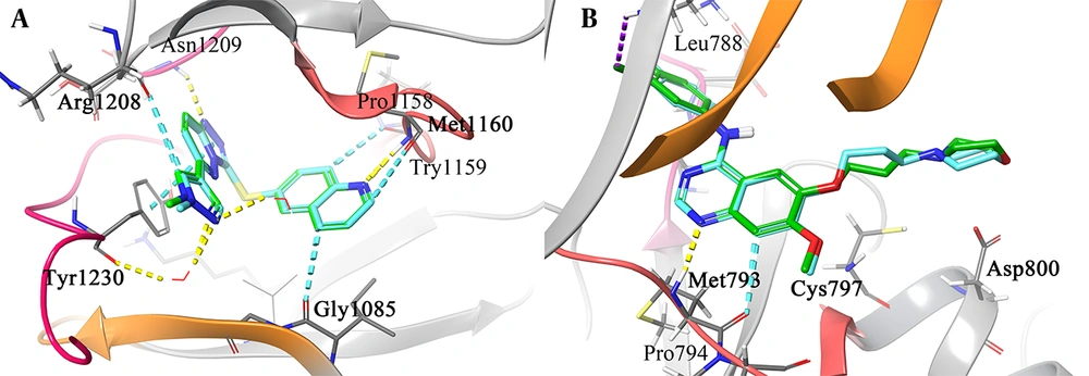 3D depiction of the binding interactions: Docked c-mesenchymal-epithelial transition factor (c-MET) shown in cyan alongside co-crystallized c-MET in green (A) and docked epidermal growth factor receptor (EGFR) in cyan with co-crystallized EGFR in green (B). The structural water and residues responsible for the H-bond interaction are rendered in stick form. The hydrogen bonding, aromatic H-bond, halogen bond, and pi-pi stacking interactions are colored in yellow, faded cyan, violet, and cyan, respectively.