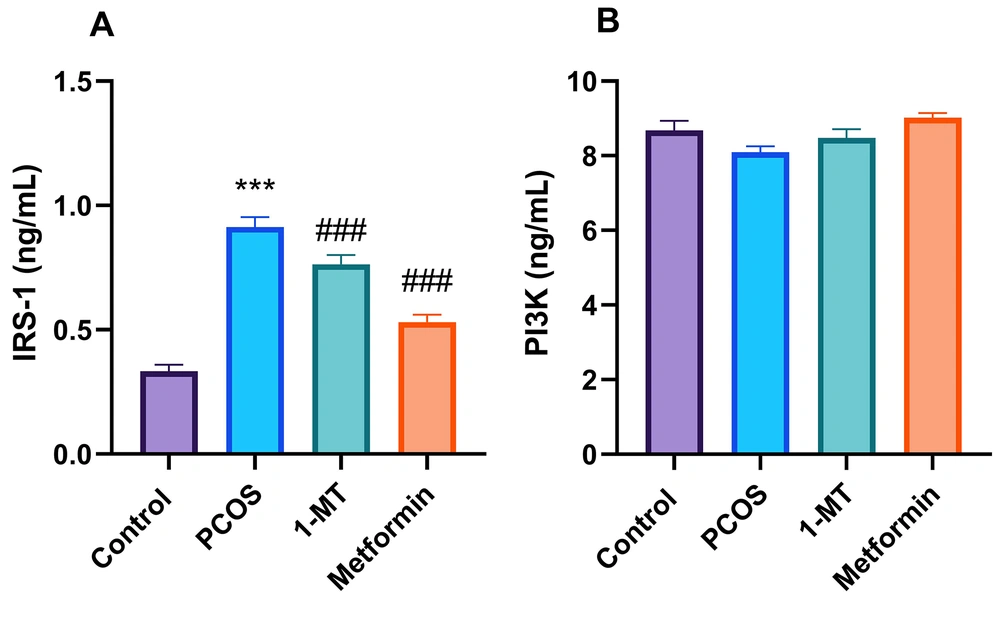 ![Ovarian expression of insulin signaling markers: A, insulin receptor substrate 1 (IRS-1) protein levels with significant changes [*** P < 0.001 vs. control; ### P < 0.001 vs. polycystic ovary syndrome (PCOS)]; B, phosphoinositide 3-kinase (PI3K) protein levels across groups (data are presented as mean ± SEM; n = 6). Ovarian expression of insulin signaling markers: A, insulin receptor substrate 1 (IRS-1) protein levels with significant changes [*** P < 0.001 vs. control; ### P < 0.001 vs. polycystic ovary syndrome (PCOS)]; B, phosphoinositide 3-kinase (PI3K) protein levels across groups (data are presented as mean ± SEM; n = 6).](https://services.brieflands.com/cdn/serve/3170d/1e97e7e00646fe04525385f75ce61f6919ac407e/ijpr-24-1-164861-i004-preview.webp)
