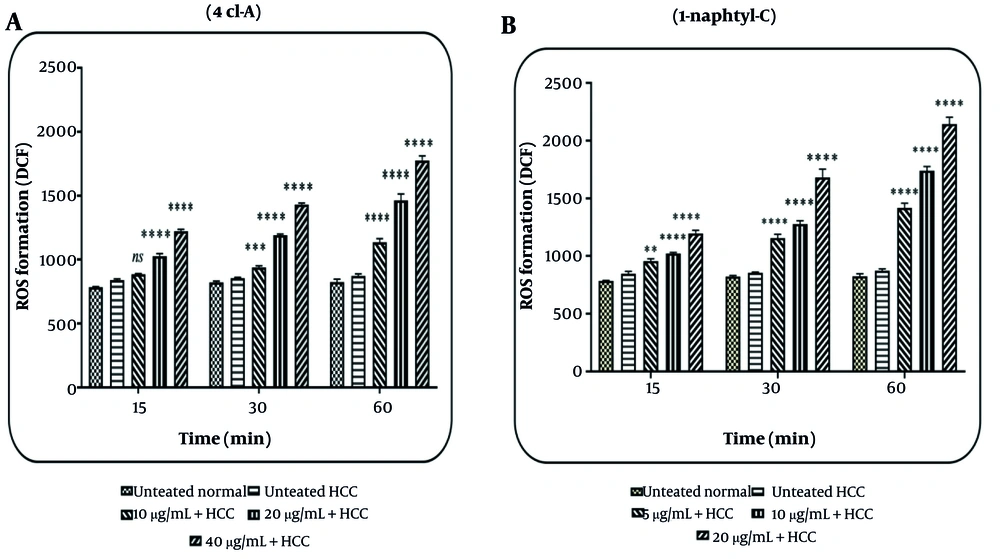 ![Reactive oxygen species (ROS) assay: The effect of A, 4cl-A (10, 20, and 40 µg/mL) and B, 1-naphtyl-C (5, 10, and 20 µg/mL) on mitochondrial ROS [data were represented as mean ± SD; n = 3; ** P < 0.01, *** P < 0.001, and **** P < 0.0001 significant difference with untreated hepatocellular carcinoma (HCC) group]. Reactive oxygen species (ROS) assay: The effect of A, 4cl-A (10, 20, and 40 µg/mL) and B, 1-naphtyl-C (5, 10, and 20 µg/mL) on mitochondrial ROS [data were represented as mean ± SD; n = 3; ** P < 0.01, *** P < 0.001, and **** P < 0.0001 significant difference with untreated hepatocellular carcinoma (HCC) group].](https://services.brieflands.com/cdn/serve/3170d/222f2e671b3f32238589d69d9e7cf8391f81b7c8/ijpr-24-1-164947-i004-preview.webp)