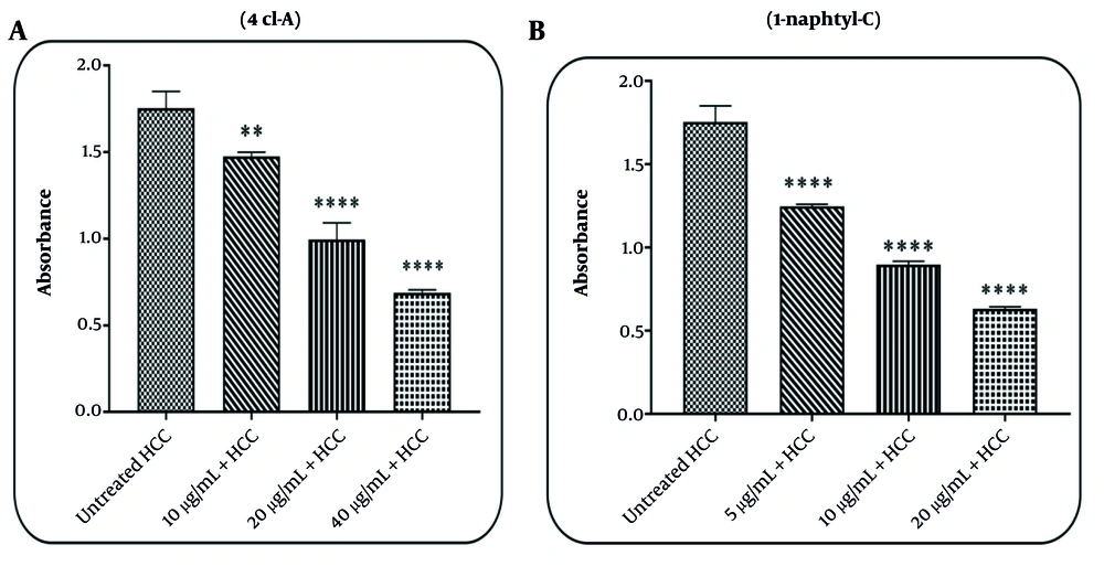 Evaluation of succinate dehydrogenase (SDH) activity: The effect of A, 4cl-A (10, 20, and 40 µg/mL) and B, 1-naphtyl-C (5, 10, and 20 µg/mL) on mitochondrial SDH activity [data were represented as mean ± SD; n = 3; ** P < 0.01 and **** P < 0.0001 significant difference with untreated hepatocellular carcinoma (HCC) group].