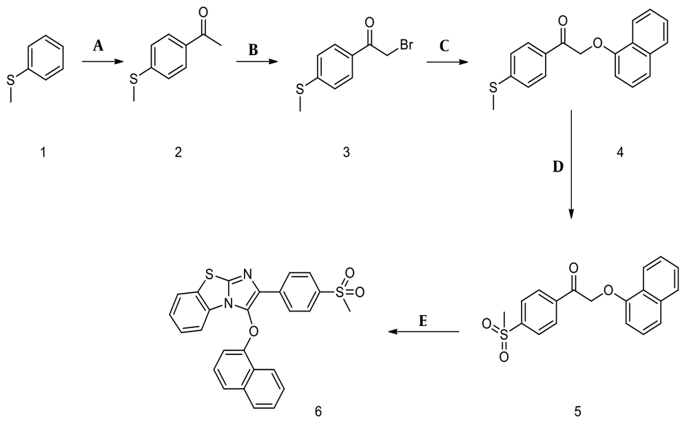 ![Synthesis of benzo[d]imidazo[2,1-b]thiazole derivative. Reagents and conditions: A, AlCl<sub>3</sub>, CH<sub>3</sub>COCl, CHCl<sub>3</sub>, 25°C, and 2h; B, Br<sub>2</sub>, CH<sub>3</sub>OH, and RT; C, K<sub>2</sub>CO<sub>3</sub>, 1-naphthol, acetone, reflux, and 5h; D, Oxone, THF, water, RT, and 5h; E, I2 (2eq), 2-aminobenzothiazole (3eq), DMF, 120°C, and 24 h. Synthesis of benzo[d]imidazo[2,1-b]thiazole derivative. Reagents and conditions: A, AlCl<sub>3</sub>, CH<sub>3</sub>COCl, CHCl<sub>3</sub>, 25°C, and 2h; B, Br<sub>2</sub>, CH<sub>3</sub>OH, and RT; C, K<sub>2</sub>CO<sub>3</sub>, 1-naphthol, acetone, reflux, and 5h; D, Oxone, THF, water, RT, and 5h; E, I2 (2eq), 2-aminobenzothiazole (3eq), DMF, 120°C, and 24 h.](https://services.brieflands.com/cdn/serve/3170d/896a13cea24bd7077d456abdb1c20d5886a968b9/ijpr-24-1-164947-i002-preview.webp)